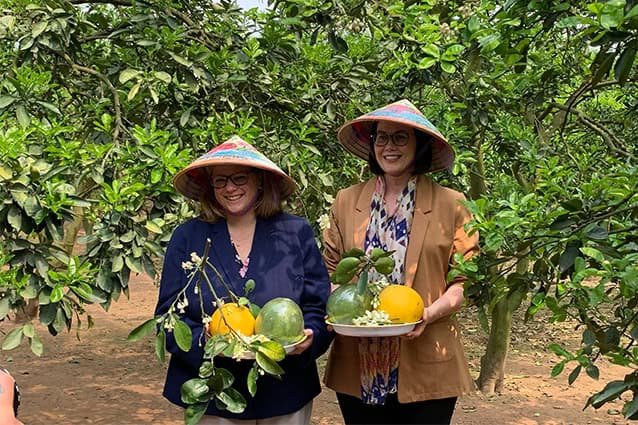 Hai thứ trưởng Bộ Nông nghiệp Hoa Kỳ, bà Alexis Taylor và bà Jenny Moffitt đã nhận quà tặng là trái bưởi giống Diễn của Việt Nam.